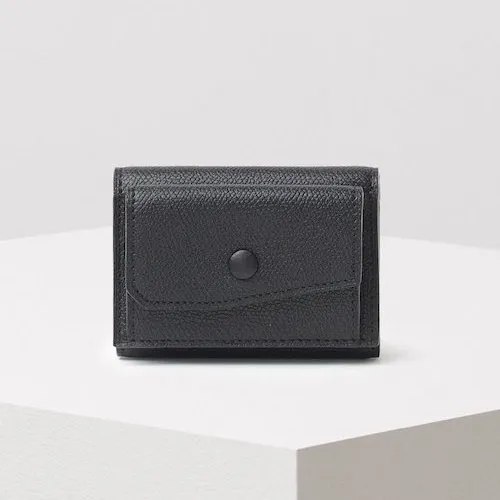 ブラックのグレインカーフレザー製を仕様したコンパクトな三つ折り財布です。正面に取り付けられたロゴの金属パーツが程良いインパクトを与えます。