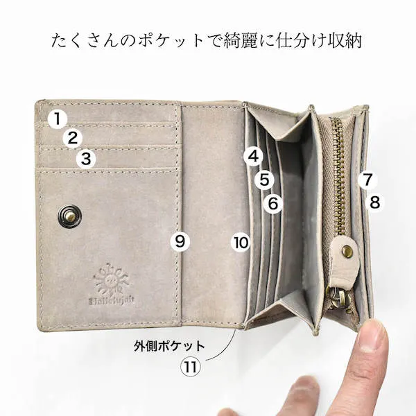 財布を開くと、ファスナー付き小銭入れに、カードポケット4つ、フラットポケット4つ、札入れ1つと意外と大容量。「一般的なミニ財布ではちょっと物足りない」という方におおすすめのモデルです。