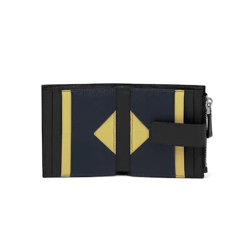 プラダを象徴する「サフィアーノ・レザー」を使用したミニ財布。スナップボタンで開閉する、ちょっと個性的な作りが目を引きます。