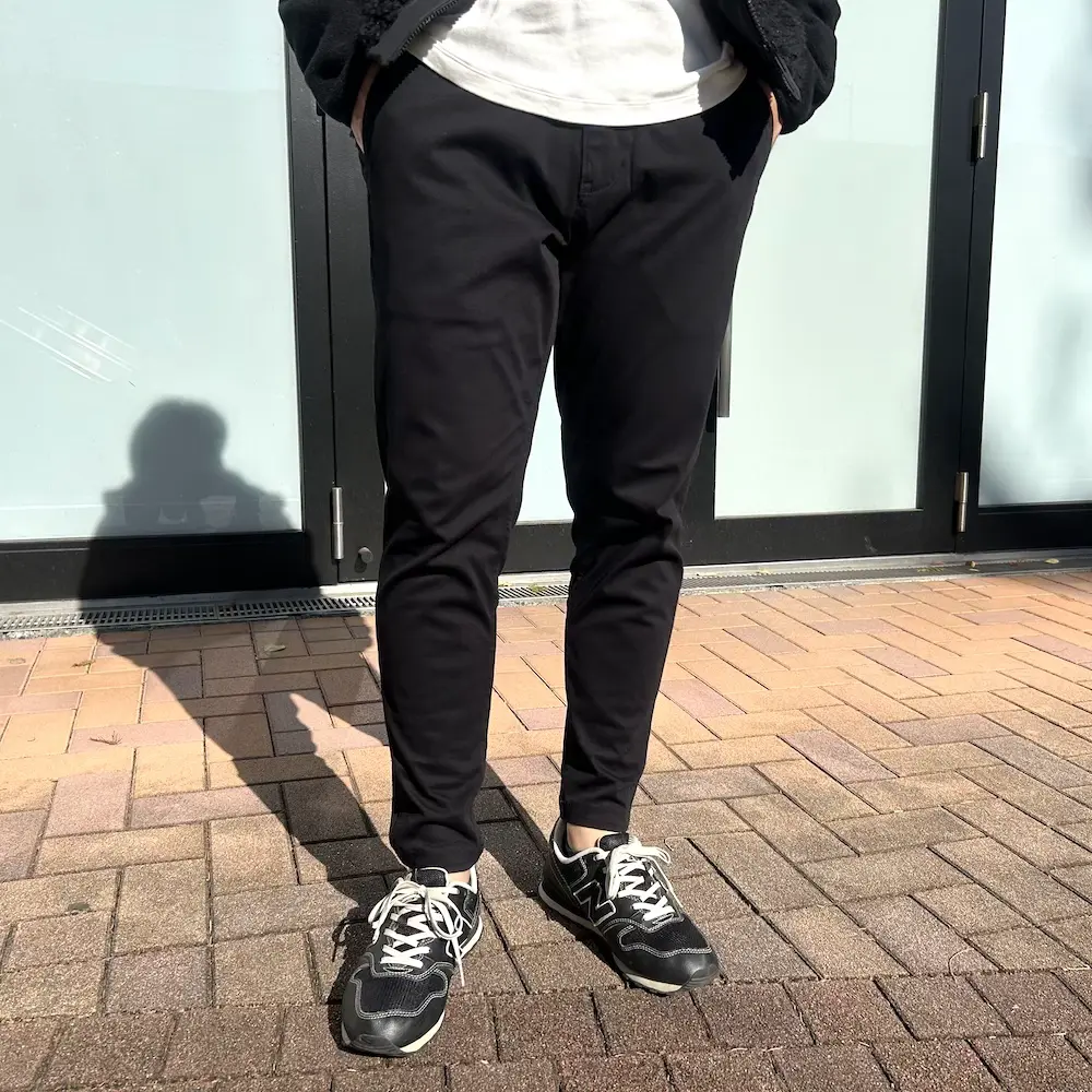 今回着用したカラーはブラックの無地。様々な生地やカラーで展開されているワンダーシェイプシリーズの中でも、ベーシックでシーズンやコーディネートを選ばない一本です。